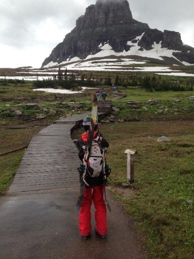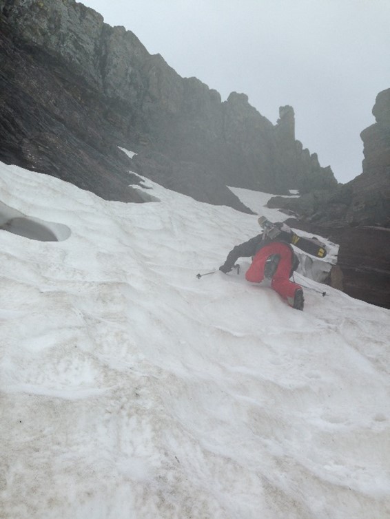 In July 2014, Cody and I headed to Glacier National Park to ski the Logan Pass snowfield below Clements Mountain. We dispersed camped at Hungry Horse Reservoir the night before and drank plenty of beer late into the night. The next morning, we drove up Logan Pass and found snow-packed mountains, lingering from a snowy winter and chilly spring. We donned our ski packs at the bustling Visitors Center, and were met with shocked, contorted faces of tourists confused by our attire on the Hidden Lake Trail. We quickly hiked towards the snowfield overlooking Hidden Lake and began assessing routes. The snowfield had three steep chutes above it, all begging to be skied. The middle chute had a passable bergschrund and continuous snow to the top, so we set our sights there and began our ascent.