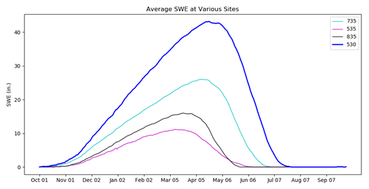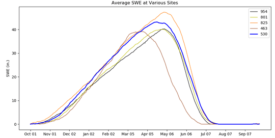 Site 954 (Turnagain Pass in AK), site 801 (Summit Lake in OR), site 825 (Tower in CO), and site 463 (Echo Peak in CA) are all in the 90th percentile of snotels. They all have similar profiles except for Echo Peak in California. Echo Peak hits its peak and melts out much earlier than the others. Summit Lake and Tower hit their peak later than Hoodoo Basin but have lower peaks.