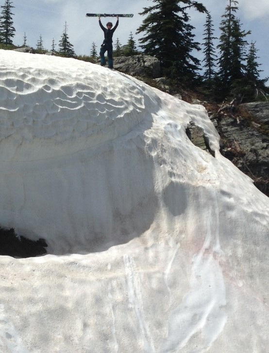 (Right): (July 2014) Tons of snow and great skiing to be found near the snotel at Hoodoo Basin in July. That’s a big cornice to drop onto firm summer snow!