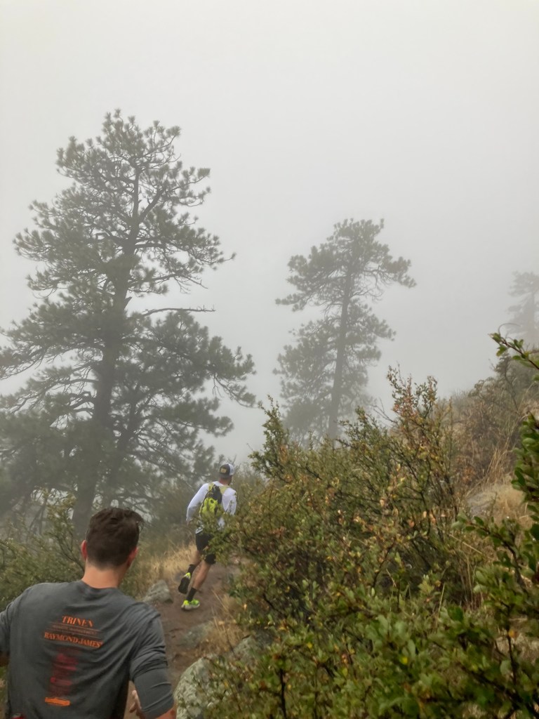 The week leading up to the race was extremely hot (97, 98, 99, and 99 with three record daily highs), but then the temperatures plummeted Friday and I woke up to low 40s and drizzle on race day. I drove to the starting line in the dark, warmed up on the sloppy muddy road, and walked over to the start with the other ~280 racers. The start was slow, with the crowd packed onto the road and splashing mud onto each other, and the climb started with a perfect slow pace for me. I mostly stuck with a large clump of runners on the first uphill, passed a few walkers, and was passed by some folks as well. The tight clump finally began to break up on the steep Timber trail switchbacks, and I was able to pass quite a few people and followed some guys who were running about my pace to the first aid station. I kept a really close eye on my HR-monitor on the uphill, hoping to stay in the low 170s during the majority of the climb, and was able to not totally blow up my legs.